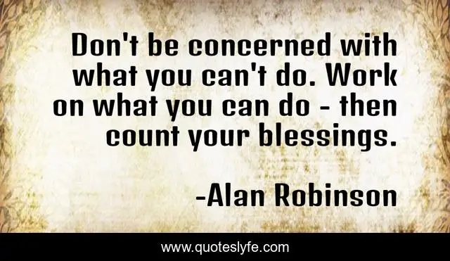 This page presents the quote "Don't be concerned with what you can't do. Work on what you can do - then count your blessings.". Author of this quote is Alan Robinson. This quote is about work, blessings,.