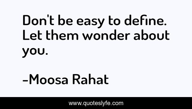 This page presents the quote "Don't be easy to define. Let them wonder about you.". Author of this quote is Moosa Rahat. This quote is about confidence, positive, motivational, optimistic, define, wonder,.