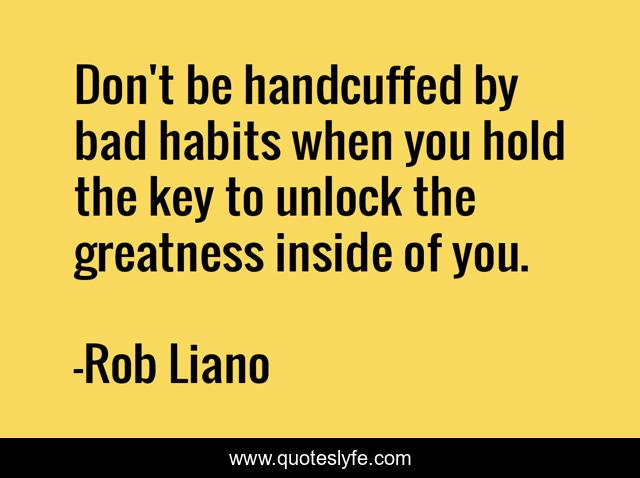 This page presents the quote "Don't be handcuffed by bad habits when you hold the key to unlock the greatness inside of you.". Author of this quote is Rob Liano. This quote is about motivation, inspire, growth, optimistic, living, inspiring, positive, positive-thinking, potential,.