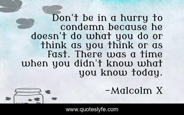 This page presents the quote "Don't be in a hurry to condemn because he doesn't do what you do or think as you think or as fast. There was a time when you didn't know what you know today.". Author of this quote is Malcolm X. This quote is about condemnation, tolerance, knowledge, understanding,.