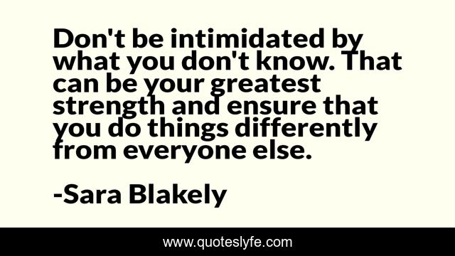 This page presents the quote "Don't be intimidated by what you don't know. That can be your greatest strength and ensure that you do things differently from everyone else.". Author of this quote is Sara Blakely. .