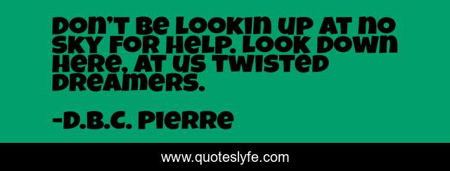 This page presents the quote "Don’t be lookin up at no sky for help. Look down here, at us twisted dreamers.". Author of this quote is D.B.C. Pierre. This quote is about god, dreams, religion,.