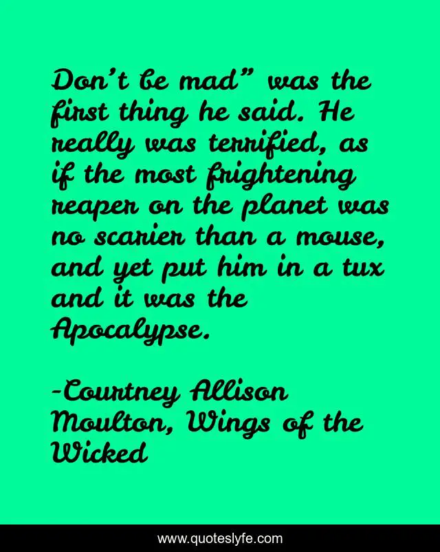 This page presents the quote "Don’t be mad” was the first thing he said. He really was terrified, as if the most frightening reaper on the planet was no scarier than a mouse, and yet put him in a tux and it was the Apocalypse.". Author of this quote is Courtney Allison Moulton, Wings of the Wicked. .