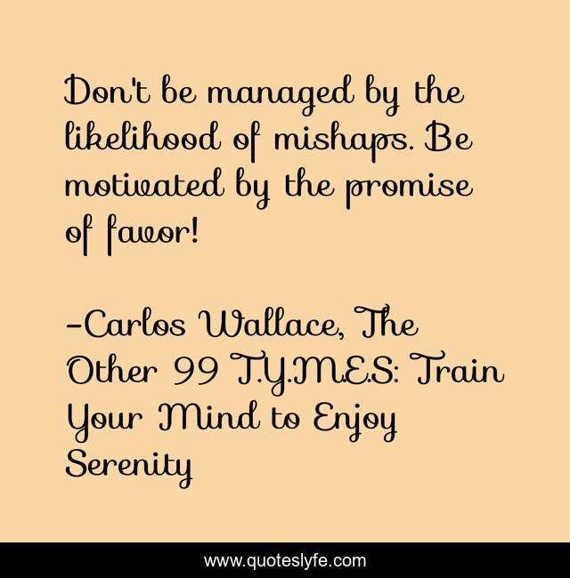 This page presents the quote "Don't be managed by the likelihood of mishaps. Be motivated by the promise of favor!". Author of this quote is Carlos Wallace, The Other 99 T.Y.M.E.S: Train Your Mind to Enjoy Serenity. This quote is about favor, fear, purpose-of-life, mishaps, motivation,.