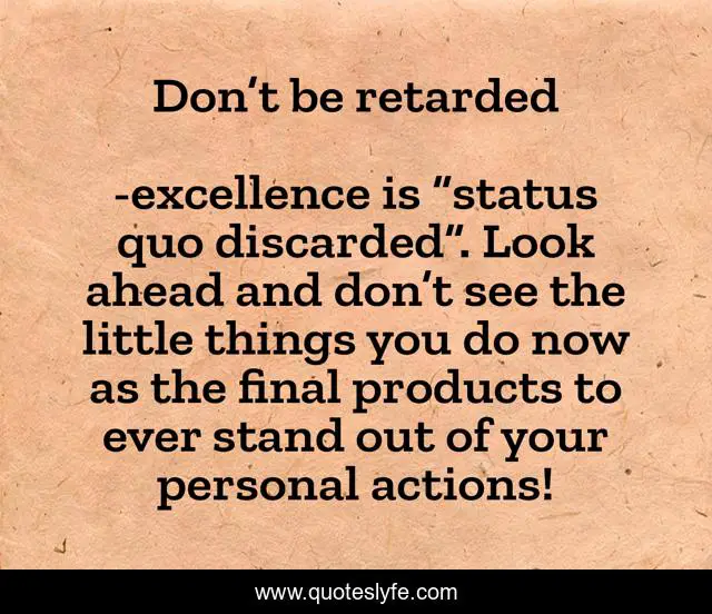"excellence is “status quo discarded”. Look ahead and don’t see the little things you do now as the final products to ever stand out of your personal actions! Quotes." Quoteslyfe.com, 2025. Fri. 05 Dec. 2025. <https://www.quoteslyfe.com/quote/Don-t-be-retarded-129761>.