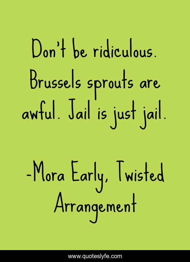 This page presents the quote "Don't be ridiculous. Brussels sprouts are awful. Jail is just jail.". Author of this quote is Mora Early, Twisted Arrangement. This quote is about food, jokes, jail, sarcasm,.