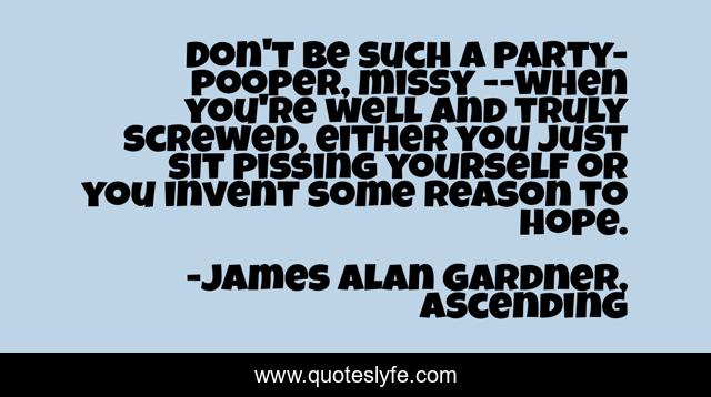 This page presents the quote "Don't be such a party-pooper, missy --when you're well and truly screwed, either you just sit pissing yourself or you invent some reason to hope.". Author of this quote is James Alan Gardner, Ascending. .