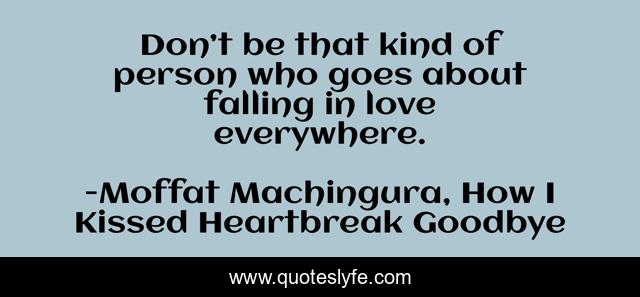 This page presents the quote "Don’t be that kind of person who goes about falling in love everywhere.". Author of this quote is Moffat Machingura, How I Kissed Heartbreak Goodbye. This quote is about person, fall-in-love-everywhere,.