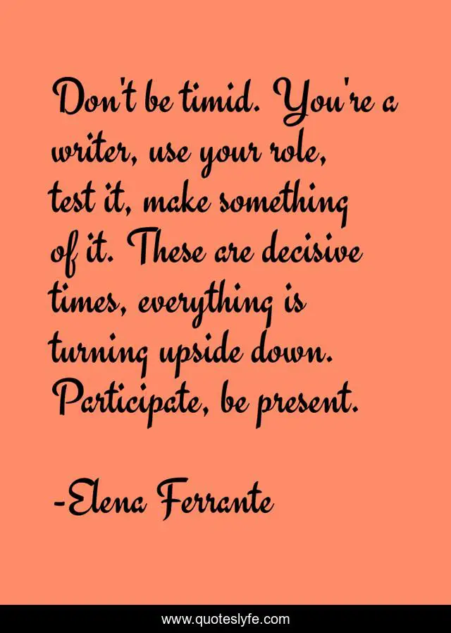 This page presents the quote "Don't be timid. You're a writer, use your role, test it, make something of it. These are decisive times, everything is turning upside down. Participate, be present.". Author of this quote is Elena Ferrante. This quote is about writing-life, engagement, writers, writing, social-activism, catalyst, change,.
