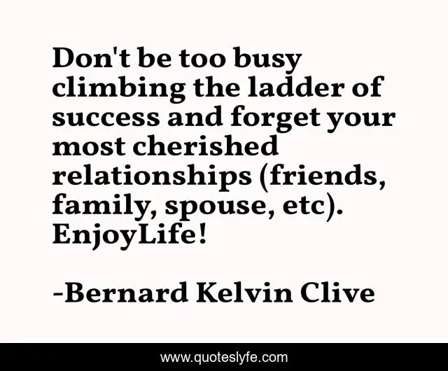 This page presents the quote "Don't be too busy climbing the ladder of success and forget your most cherished relationships (friends, family, spouse, etc). EnjoyLife!". Author of this quote is Bernard Kelvin Clive. This quote is about relationships, life,.