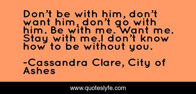 This page presents the quote "Don’t be with him, don’t want him, don’t go with him. Be with me. Want me. Stay with me.I don’t know how to be without you.". Author of this quote is Cassandra Clare, City of Ashes. This quote is about heartache, love, clary-fray, pain, jace-wayland, affection,.