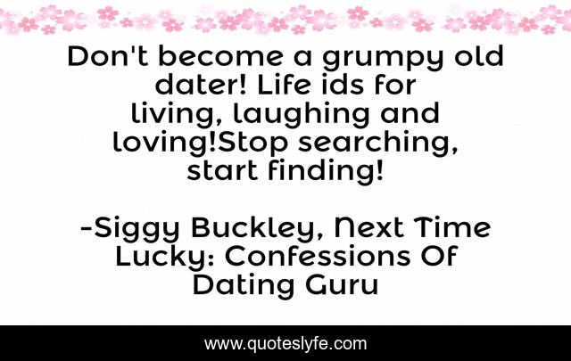 This page presents the quote "Don't become a grumpy old dater! Life ids for living, laughing and loving!Stop searching, start finding!". Author of this quote is Siggy Buckley, Next Time Lucky: Confessions Of Dating Guru. This quote is about love, dating, mr-right, ireland, affection,.
