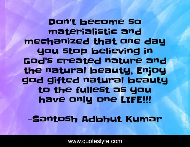 This page presents the quote "Don't become so materialistic and mechanized that one day you stop believing in God's created nature and the natural beauty, Enjoy god gifted natural beauty to the fullest as you have only one LIFE!!!". Author of this quote is Santosh Adbhut Kumar. This quote is about life, adbhut, nature, god, materialistic, nature-s-beauty, mechanized,.