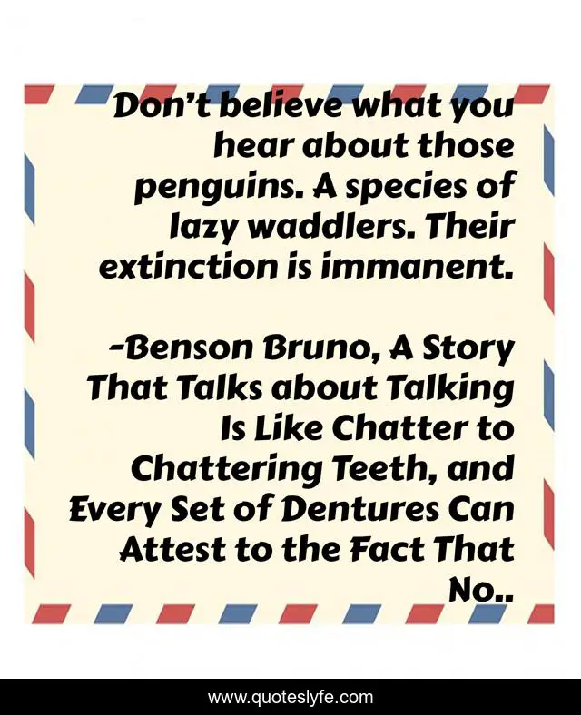 This page presents the quote "Don’t believe what you hear about those penguins. A species of lazy waddlers. Their extinction is immanent.". Author of this quote is Benson Bruno, A Story That Talks about Talking Is Like Chatter to Chattering Teeth, and Every Set of Dentures Can Attest to the Fact That No... This quote is about extinction, funny, comedy, penguins,.