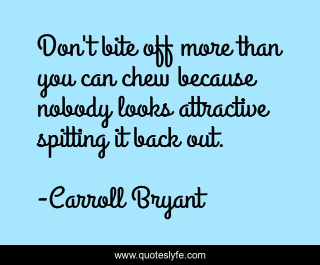 This page presents the quote "Don't bite off more than you can chew because nobody looks attractive spitting it back out.". Author of this quote is Carroll Bryant. This quote is about philisophical, philosophy-of-life, life-and-living, humor, life-lessons,.