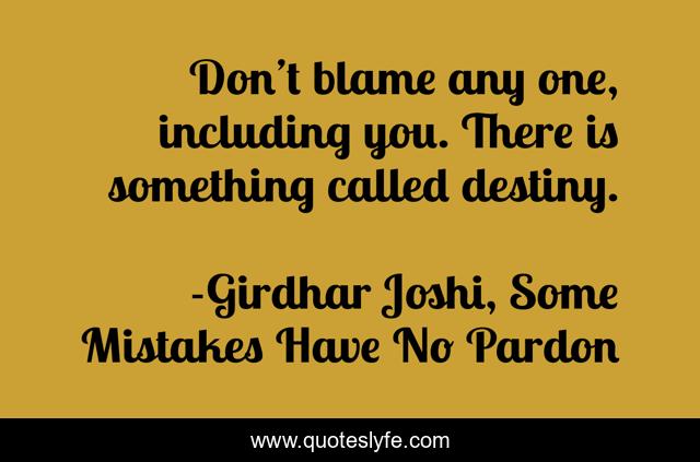 This page presents the quote "Don’t blame any one, including you. There is something called destiny.". Author of this quote is Girdhar Joshi, Some Mistakes Have No Pardon. This quote is about blame, mistakes, destiny,.