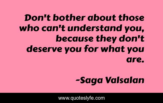 This page presents the quote "Don't bother about those who can't understand you, because they don't deserve you for what you are.". Author of this quote is Saga Valsalan. This quote is about thought, enthusiasm, life, inspirational,.