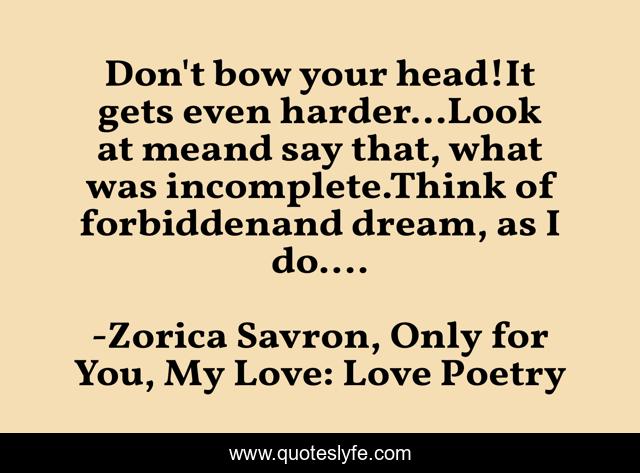 This page presents the quote "Don't bow your head!It gets even harder...Look at meand say that, what was incomplete.Think of forbiddenand dream, as I do....". Author of this quote is Zorica Savron, Only for You, My Love: Love Poetry. This quote is about forbidden-love, love, love-poetry, affection,.