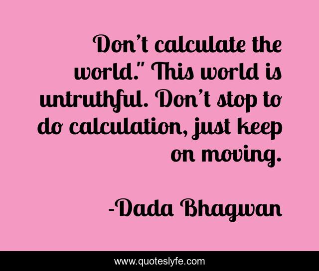 This page presents the quote "Don’t calculate the world." This world is untruthful. Don’t stop to do calculation, just keep on moving.". Author of this quote is Dada Bhagwan. This quote is about calculation, world, spiritual,.