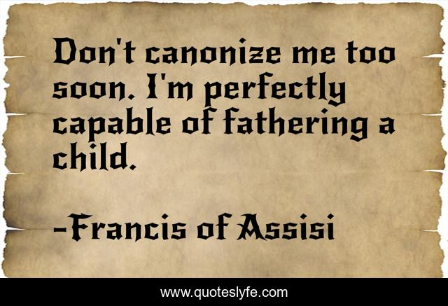 This page presents the quote "Don't canonize me too soon. I'm perfectly capable of fathering a child.". Author of this quote is Francis of Assisi. This quote is about desire, christian, saints,.