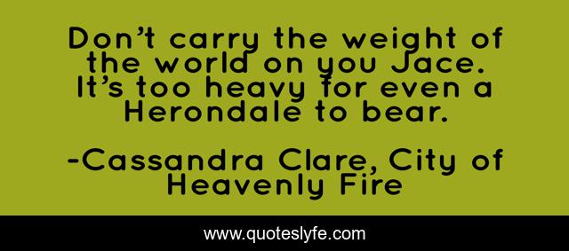 This page presents the quote "Don’t carry the weight of the world on you Jace. It’s too heavy for even a Herondale to bear.". Author of this quote is Cassandra Clare, City of Heavenly Fire. This quote is about city-of-heavenly-fire, the-mortal-instruments, book, inspirational, enthusiasm, jace-herondale,.