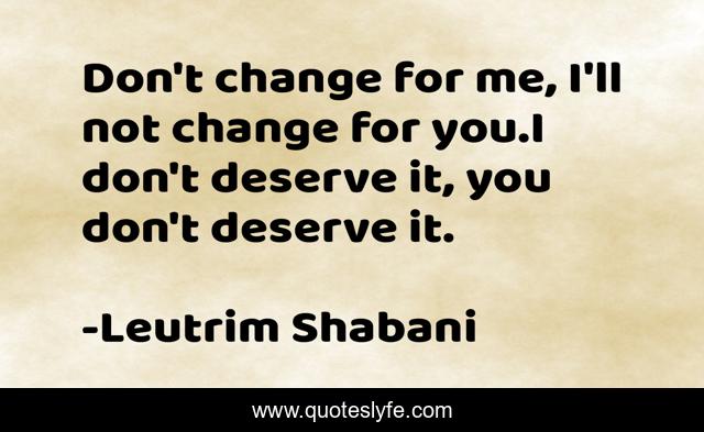 This page presents the quote "Don't change for me, I'll not change for you.I don't deserve it, you don't deserve it.". Author of this quote is Leutrim Shabani. This quote is about advice, love, life-lessons, affection,.