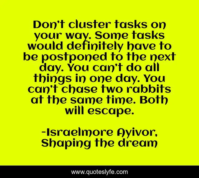This page presents the quote "Don’t cluster tasks on your way. Some tasks would definitely have to be postponed to the next day. You can’t do all things in one day. You can’t chase two rabbits at the same time. Both will escape.". Author of this quote is Israelmore Ayivor, Shaping the dream. This quote is about food-for-thought, tasks, rats, israelmore-ayivor, shift, time-management, two, delay, cluster,.