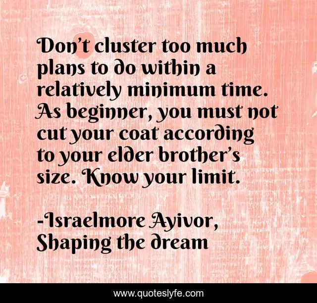 This page presents the quote "Don’t cluster too much plans to do within a relatively minimum time. As beginner, you must not cut your coat according to your elder brother’s size. Know your limit.". Author of this quote is Israelmore Ayivor, Shaping the dream. This quote is about beginner, relative, cluster, minimum, clutter, relatively, cut, stressful, size,.