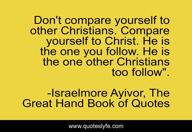 This page presents the quote "Don't compare yourself to other Christians. Compare yourself to Christ. He is the one you follow. He is the one other Christians too follow".". Author of this quote is Israelmore Ayivor, The Great Hand Book of Quotes. This quote is about jesus-christ, compare, bible, christ, king-of-kings, god, lord-of-lords, food-for-thought, jesus,.