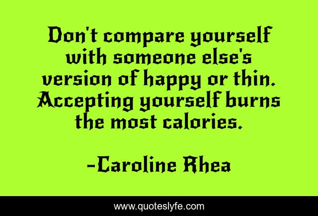 This page presents the quote "Don't compare yourself with someone else's version of happy or thin. Accepting yourself burns the most calories.". Author of this quote is Caroline Rhea. This quote is about compare, happy, yourself,.