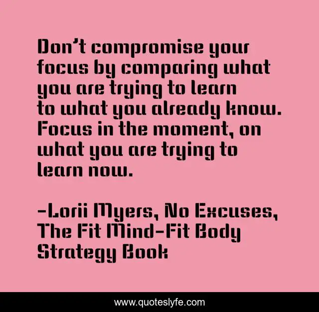 This page presents the quote "Don’t compromise your focus by comparing what you are trying to learn to what you already know. Focus in the moment, on what you are trying to learn now.". Author of this quote is Lorii Myers, No Excuses, The Fit Mind-Fit Body Strategy Book. This quote is about focus, learning,.