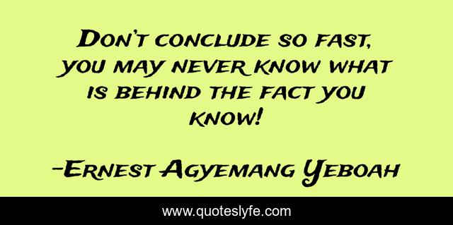This page presents the quote "Don’t conclude so fast, you may never know what is behind the fact you know!". Author of this quote is Ernest Agyemang Yeboah. This quote is about facts, conclusion-before-evidence, first-impressions, accusations, the-truth,.