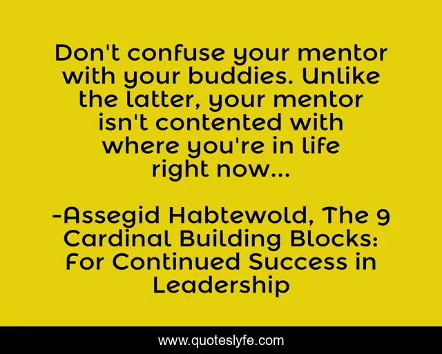 This page presents the quote "Don't confuse your mentor with your buddies. Unlike the latter, your mentor isn't contented with where you're in life right now...". Author of this quote is Assegid Habtewold, The 9 Cardinal Building Blocks: For Continued Success in Leadership. This quote is about friends, contented, mentor,.