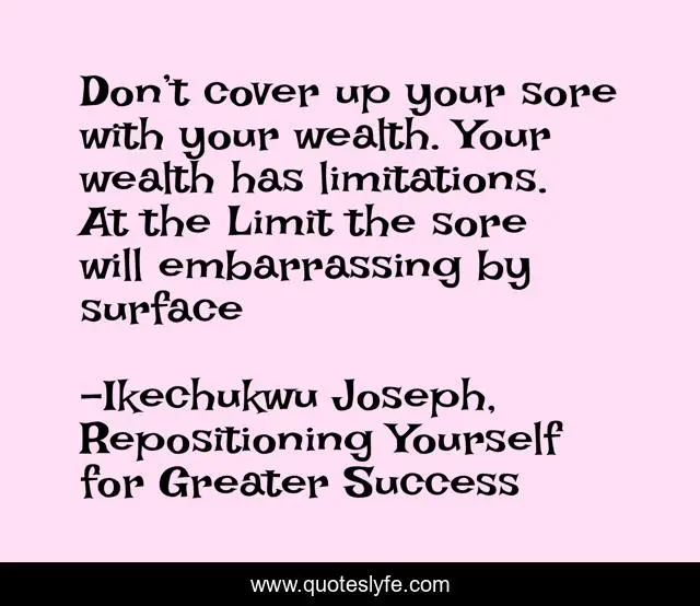 This page presents the quote "Don’t cover up your sore with your wealth. Your wealth has limitations. At the Limit the sore will embarrassing by surface". Author of this quote is Ikechukwu Joseph, Repositioning Yourself for Greater Success. This quote is about positive, christian-life, motivational, optimistic, confidence,.