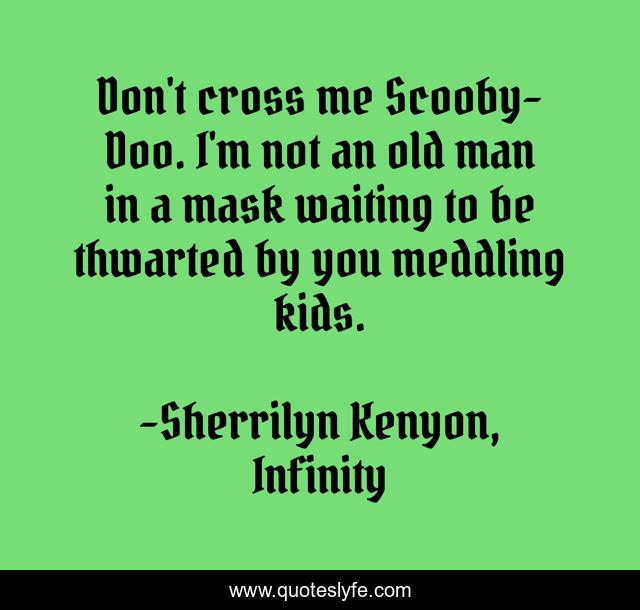 This page presents the quote "Don't cross me Scooby-Doo. I'm not an old man in a mask waiting to be thwarted by you meddling kids.". Author of this quote is Sherrilyn Kenyon, Infinity. This quote is about funny, comedy, tv-reference,.