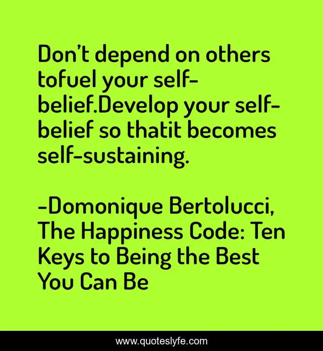 This page presents the quote "Don’t depend on others tofuel your self-belief.Develop your self-belief so thatit becomes self-sustaining.". Author of this quote is Domonique Bertolucci, The Happiness Code: Ten Keys to Being the Best You Can Be. This quote is about life-coaching, motivation, how-to-be-happier, life-coach, be-happy, how-to-be-happy, happiness-advice, happiness, be-more-motivated,.