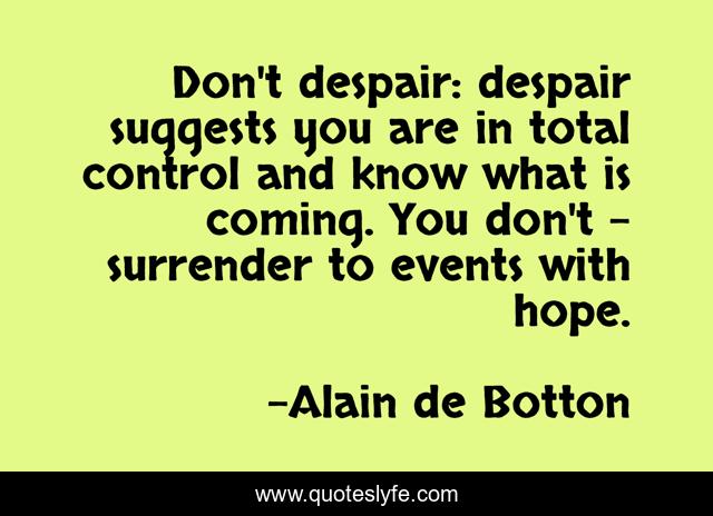 This page presents the quote "Don't despair: despair suggests you are in total control and know what is coming. You don't - surrender to events with hope.". Author of this quote is Alain de Botton. This quote is about control, foresight, surrender, hope, despair,.