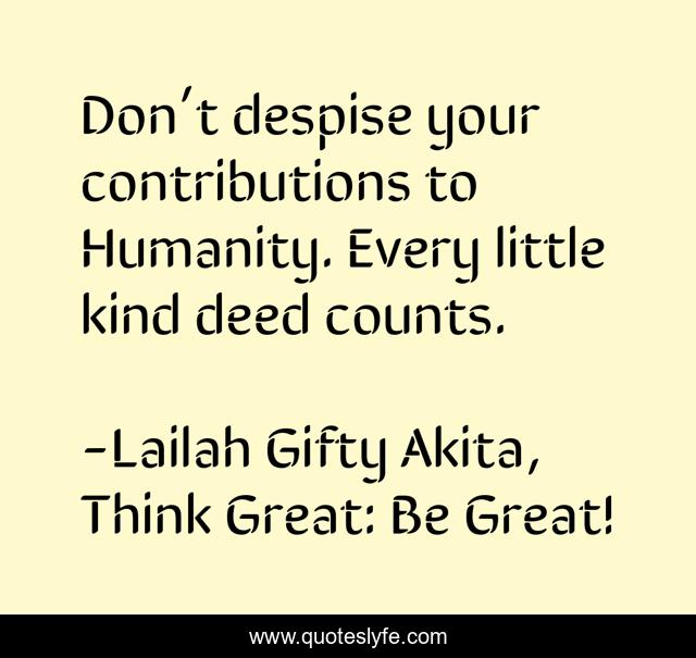 "Lailah Gifty Akita, Think Great: Be Great! Quotes." Quoteslyfe.com, 2025. Sun. 07 Dec. 2025. <https://www.quoteslyfe.com/quote/Don-t-despise-your-contributions-to-Humanity-169119>.