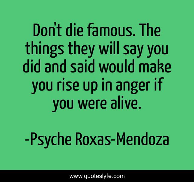 This page presents the quote "Don't die famous. The things they will say you did and said would make you rise up in anger if you were alive.". Author of this quote is Psyche Roxas-Mendoza. This quote is about die, rise, alive, famous, things, anger,.