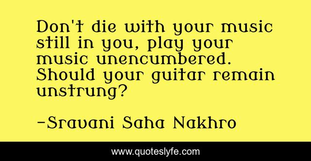 This page presents the quote "Don't die with your music still in you, play your music unencumbered. Should your guitar remain unstrung?". Author of this quote is Sravani Saha Nakhro. .