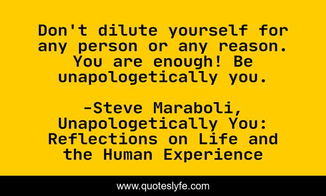 This page presents the quote "Don't dilute yourself for any person or any reason. You are enough! Be unapologetically you.". Author of this quote is Steve Maraboli, Unapologetically You: Reflections on Life and the Human Experience. This quote is about be-yourself, enthusiasm, life, happiness, inspirational,.