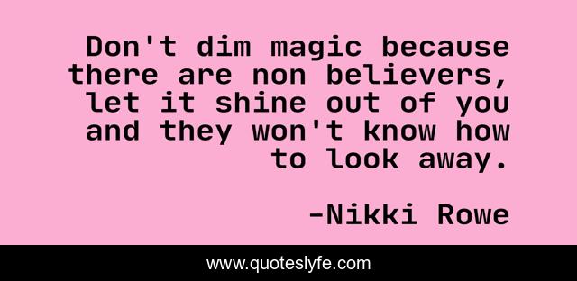 This page presents the quote "Don't dim magic because there are non believers, let it shine out of you and they won't know how to look away.". Author of this quote is Nikki Rowe. This quote is about empowerment, magic, quotes-and-sayings, light, life, soul, lightworkers, quote-of-the-day, love,.