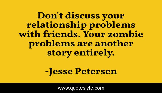 This page presents the quote "Don't discuss your relationship problems with friends. Your zombie problems are another story entirely.". Author of this quote is Jesse Petersen. This quote is about marriage-advice, humor, zombies,.