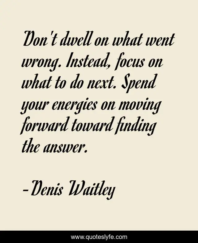 This page presents the quote "Don't dwell on what went wrong. Instead, focus on what to do next. Spend your energies on moving forward toward finding the answer.". Author of this quote is Denis Waitley. This quote is about moving forward, focus,.