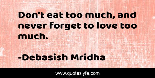 This page presents the quote "Don't eat too much, and never forget to love too much.". Author of this quote is Debasish Mridha. This quote is about don-t-eat-too-much, debasish, mridha, philosophy, debasish-mridha, love-too-much, never-forget-to-love,.
