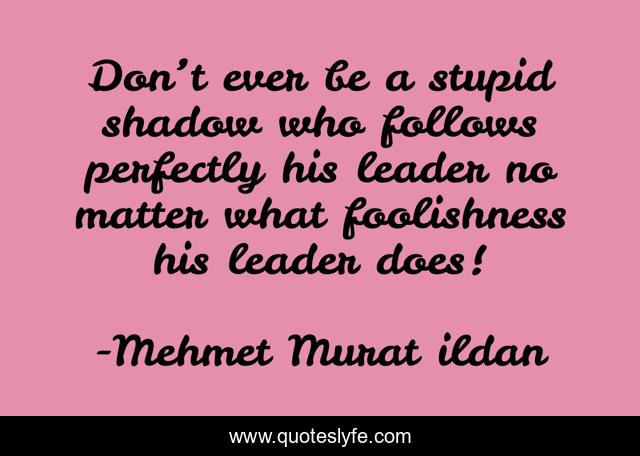 This page presents the quote "Don’t ever be a stupid shadow who follows perfectly his leader no matter what foolishness his leader does!". Author of this quote is Mehmet Murat ildan. This quote is about shadows, leaders, murat-ildan, stupidity, stupid, turkish-writers, shadow, leader,.