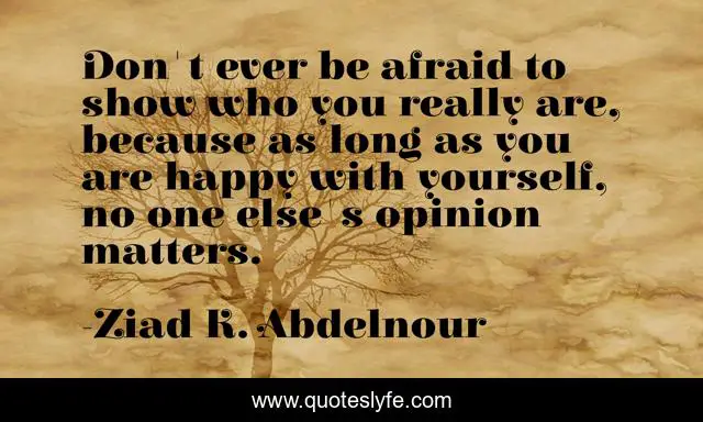 This page presents the quote "Don't ever be afraid to show who you really are, because as long as you are happy with yourself, no one else's opinion matters.". Author of this quote is Ziad K. Abdelnour. This quote is about opinion, afraid, happy,.
