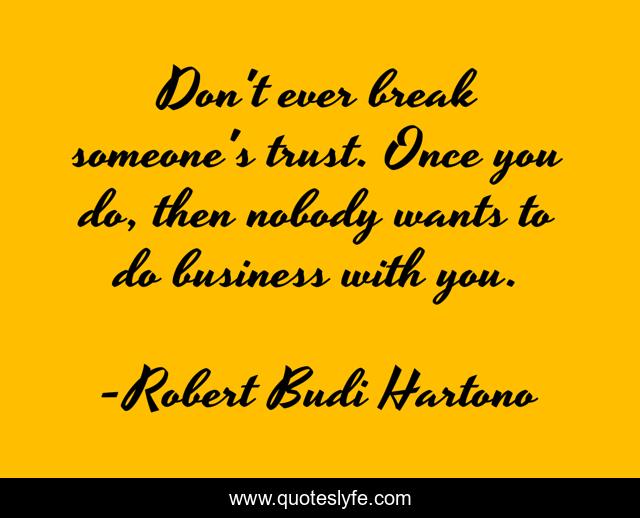 This page presents the quote "Don't ever break someone's trust. Once you do, then nobody wants to do business with you.". Author of this quote is Robert Budi Hartono. This quote is about nobody, business,.