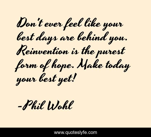 This page presents the quote "Don't ever feel like your best days are behind you. Reinvention is the purest form of hope. Make today your best yet!". Author of this quote is Phil Wohl. This quote is about belief, hope,.