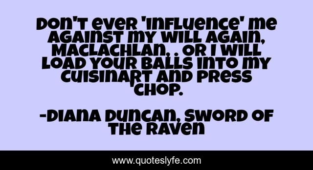 This page presents the quote "Don't ever 'influence' me against my will again, MacLachlan, . Or I will load your balls into my Cuisinart and press 'chop.". Author of this quote is Diana Duncan, Sword of the Raven. .